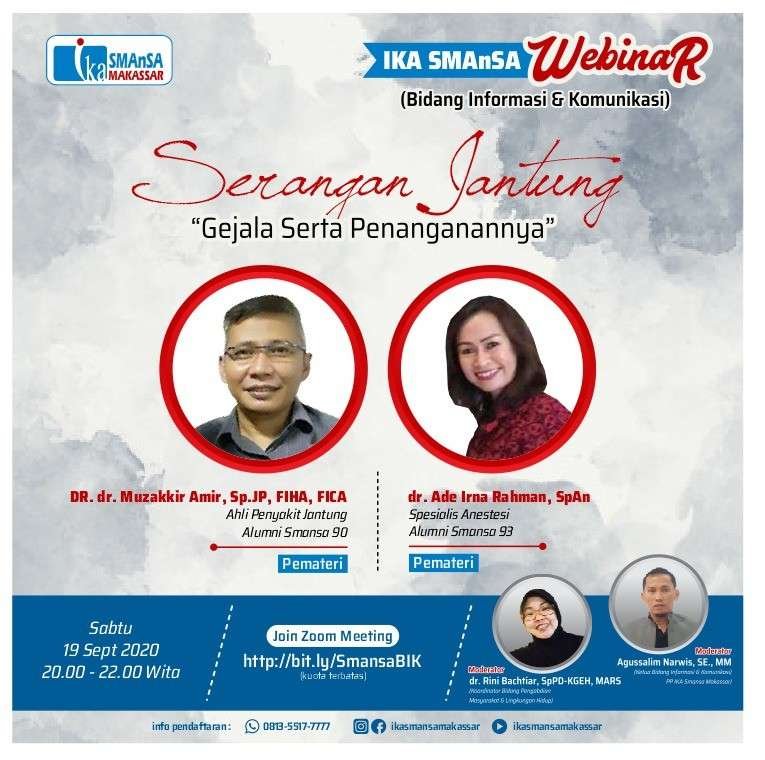 Narasumber dalam webinar berjudul ‘Serangan Jantung: Gejala serta penanganannya’ ini adalah dr. Muzakkir Amir, Sp.JP, FIHA, FICA. Muzakir merupakan Dokter Jantung yang berpraktik di Siloam Makassar dan berpraktik pula di RSUP Dr.Wahidin Sudirohusodo Makassar.